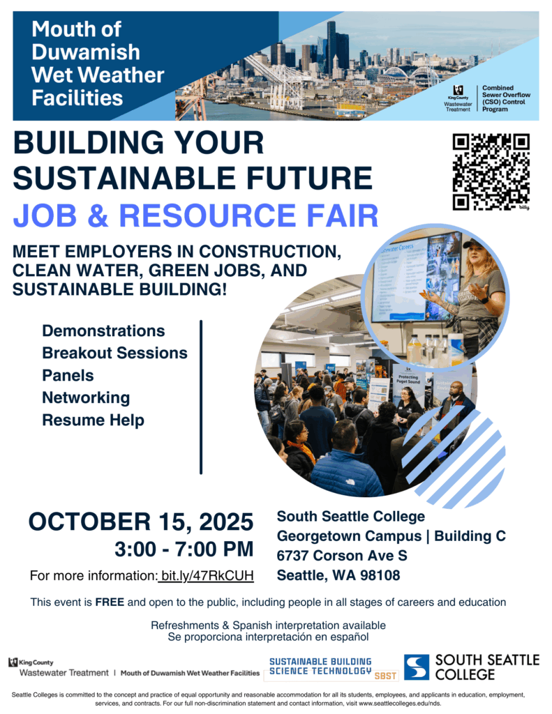 King County WTD is co-sponsoring this event as part of our community outreach effort for the Mouth of Duwamish Wet Weather Facilities program, aiming to connect with people who live and work in South Seattle with family-wage jobs. It builds on annual job fairs in partnership with South Seattle College, which attract hundreds of attendees each year.